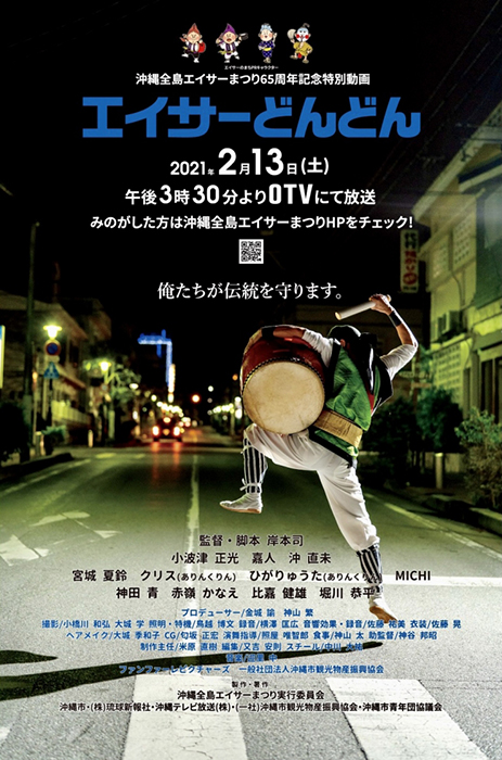 沖縄全島エイサーまつり50周年記念作品。沖縄市コザを舞台に、出場を目指す青年会と、島に戻った息子と母の再生を描く。太鼓の鼓動に乗せ、エイサーが街と世代を結ぶ力、家族の誇りを描写。青年会の葛藤と成長、祭りの熱気を臨場感豊かに刻む。英語字幕版も公開、YouTubeで視聴可。